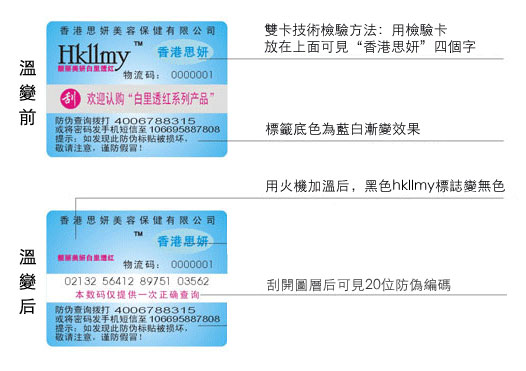 防伪标签使用了先进的温变防伪等多种高科技防伪手段: