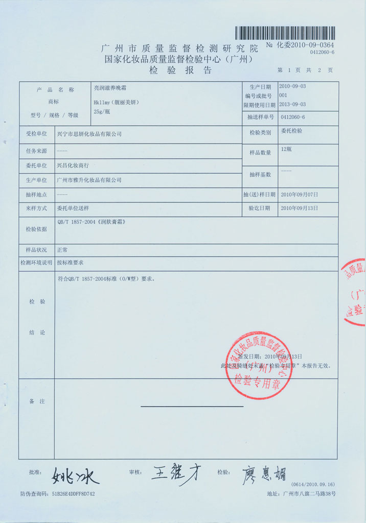 亮润美白日霜质检报告