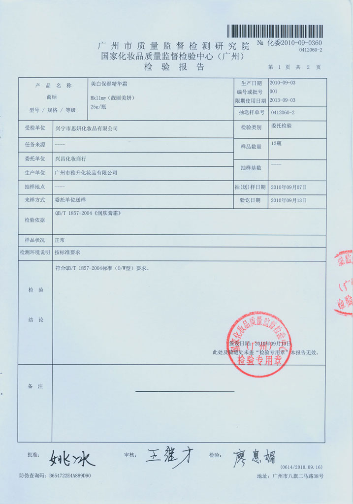 美白保湿精华霜质检报告