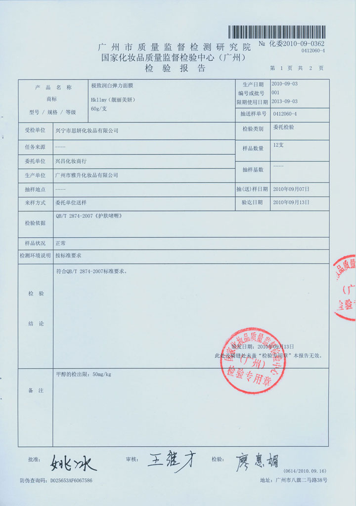 极致润白弹力面膜质检报告